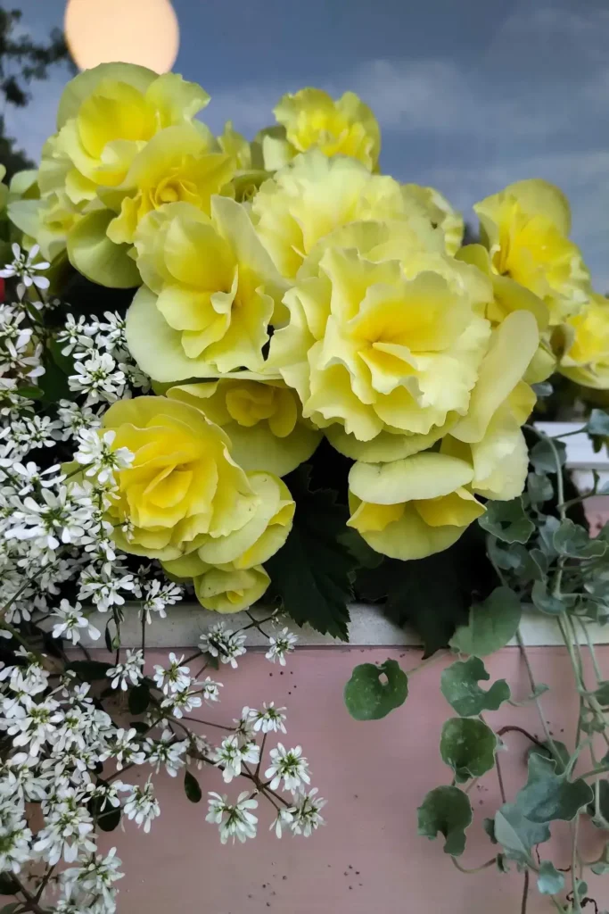 I didn’t plan this combination, but the soft yellow begonias and tiny white flowers ended up working together perfectly. It’s one of those containers that just seems to glow in the evening light.