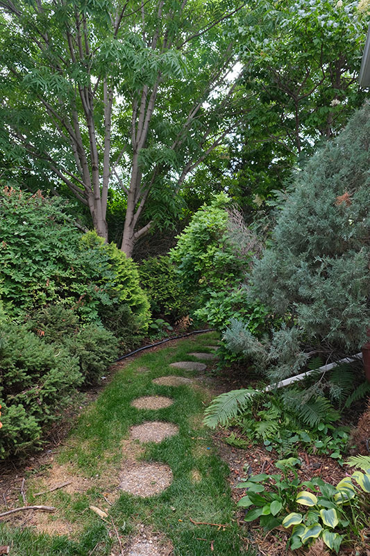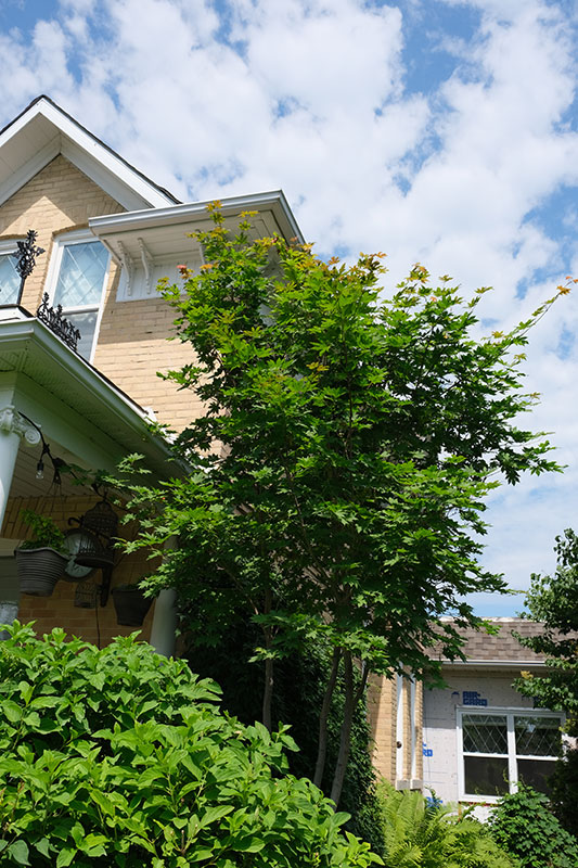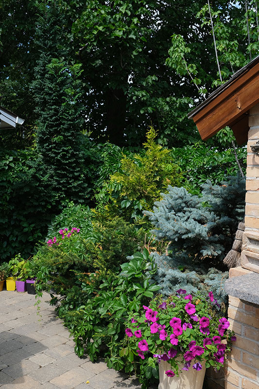 He likes to plant his trees in clusters that show off their colour and shape, setting pyramidal cedars against globe forms and the spreading branches of nesting spruce. As contrast, he might plant a sugar maple in the centre so that, come fall, there is a symphony of colour to admire. Throughout his property, among the 41 trees he has planted, there are multiples of several species of sugar maples: ‘Autumn Spire’ red maple, ‘Northwood Red’ maple, ‘Lord Selkirk’ and ‘Rocky Mountain’ sugar maples, and Korean maple, which he says is hardier than the coveted Japanese maple.