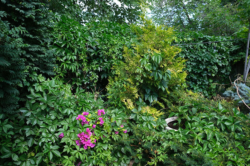 Doyle’s tree love is not limited to maples and spruce. Smitten with their brilliant chartreuse colour, he has planted 13 ‘Yellow Ribbon’ cedars. He has a Manchurian ash, a pin oak, a hackberry, and honeysuckle shrubs. False spirea cuddles the pizza oven on one side with blue spruce and golden cedar on the other side, all backed by a thick planting of Virginia creeper. In one sheltered spot is his prize: a young Gingko biloba, which he planted 16 years ago in memory of his father who passed away from cancer.