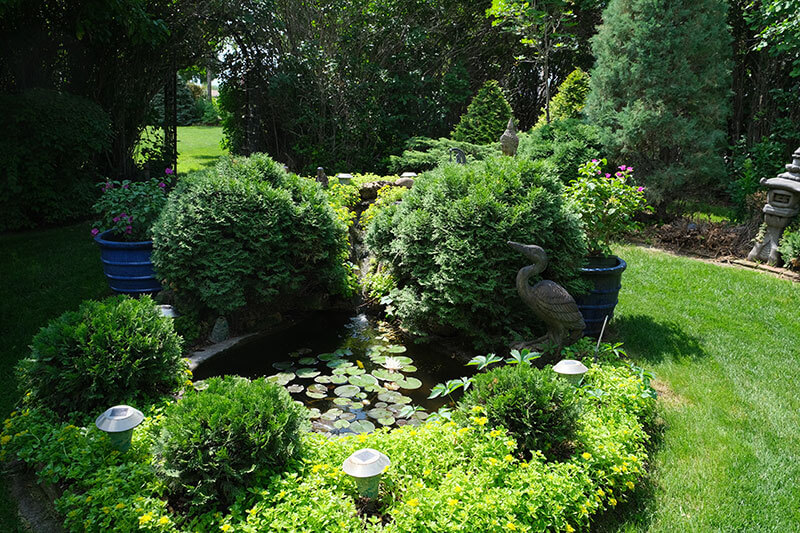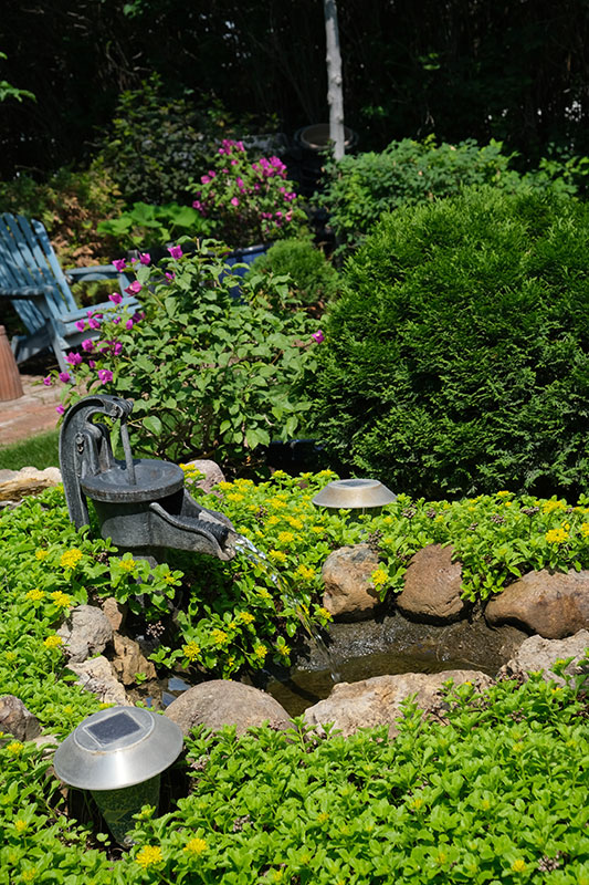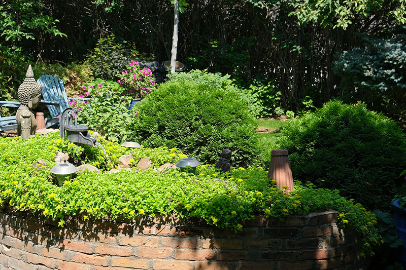 He calls himself more of a landscaper than a gardener, but he could teach most landscapers a thing or two about plants. For example, he uses masses of low growing, golden sedum to set off back-to-back ponds, always punctuated by his first love, woody plants such as dwarf globe cedar, which he keeps neatly trimmed but not rigidly pruned.
