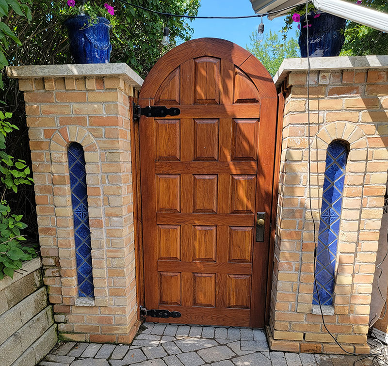 At the other end of the courtyard, the entry point, is a stunning arched oaken door. This was bult by a local artisan, Robert Heath, originally from England. The door is set between two brick pillars, built by Rudy, and highlighted with an inset of cobalt blue tile.