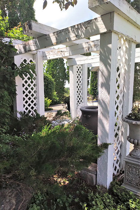 This is not the only cooling space. Lorna has created another haven at the side of the house where her building handiwork once again takes centre stage in the shape of a white pergola.