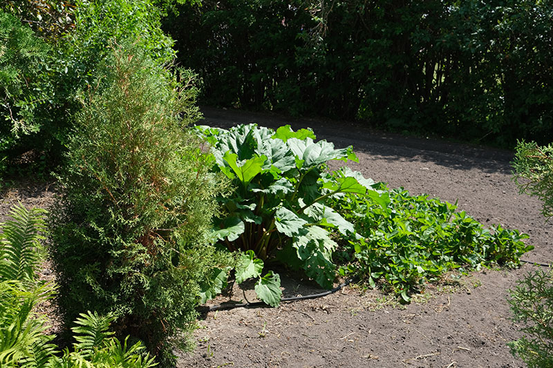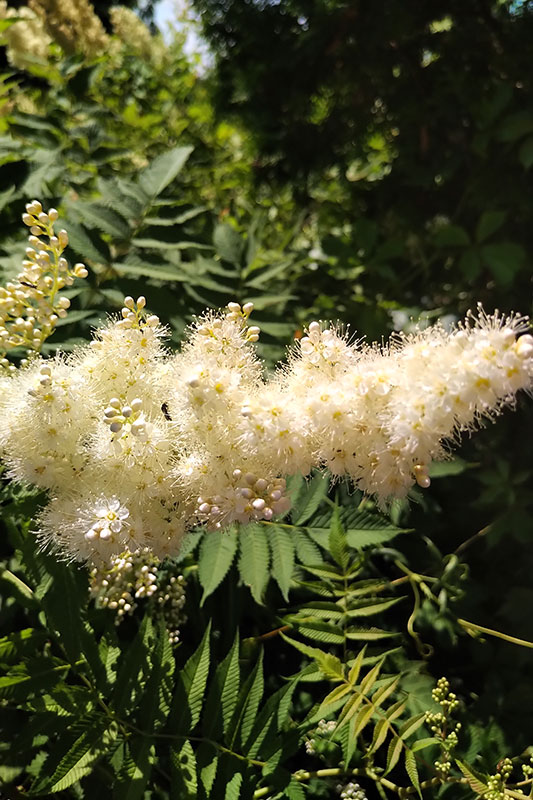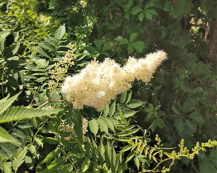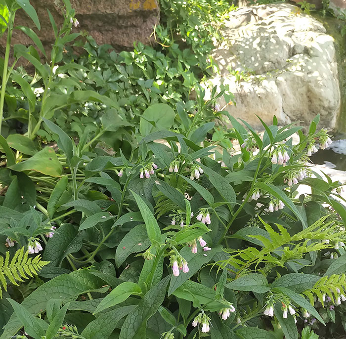 This is a garden of subtle hues and lots of greenery, much of it domesticated native species. One example is a large clump of comfrey with its soft leaves and pendulous, bell-shaped flowers. The yard is surrounded by plants she loves—many shrubs and big green plants such as castor bean, daylilies, hosta and bergenia. She sees the beauty in sumac with its beautiful white sprays of bloom and its lacy leaves.