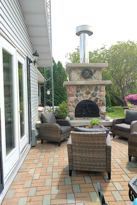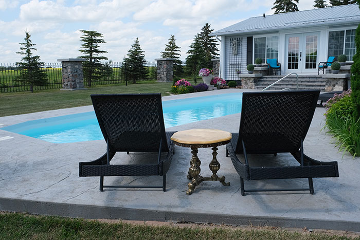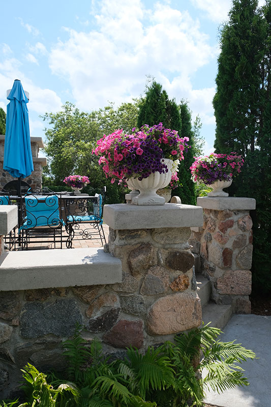 Fieldstone pillars hold formal topiary plants flanking stone steps that are mounted to a deck that opens through some French doors to a grand room. Before entering, a look back reveals more fieldstone pillars, topped by cement platforms to hold planters. The pillars also form an important part of the wrought iron fencing that surrounds the yard, separating it from the fields beyond. The remarkable thing about this view is that Lorna herself built the pillars after researching how it was done. That project typifies what is encountered indoors in what Lorna calls the pool house.