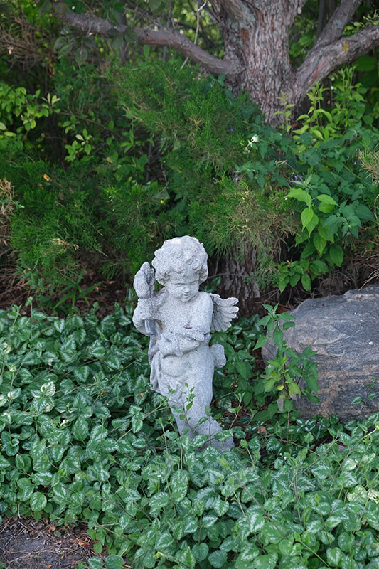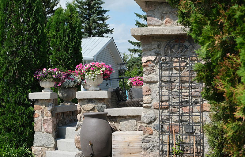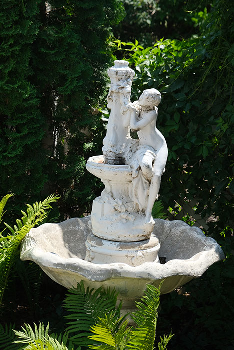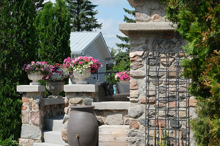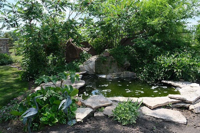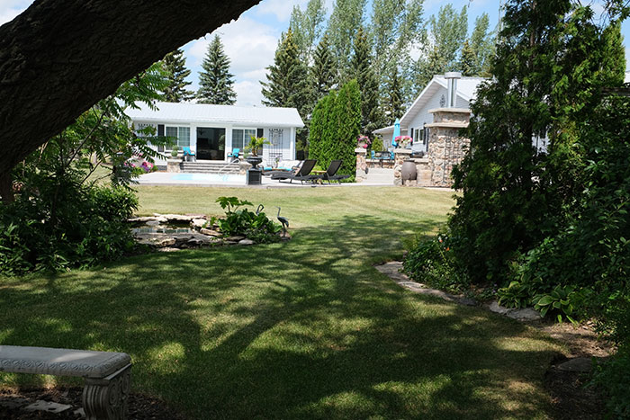 Reluctantly leaving this marvel, Lorna urges visitors toward a cool place on the far side of the pool where a small waterfall appears to feed its depths. Huge rocks in and around the pond and some limestone edges testify to its authenticity as a spring. Exotic-looking sumac frames the scene. Then there is the ancient Manitoba maple that spreads its arms over this part of the yard, providing welcome shade on a hot day.