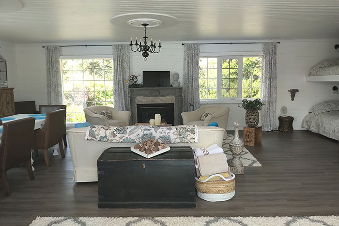 The doors open onto a lovely room, a fireplace set between twin windows at the far wall. Cozy armchairs and a couch frame the fireplace. A rustic antique trunk serves as a coffee table. And an antique light fixture hangs from the ceiling. Behind the couch is a polished wooden chest supporting an old tic-tac-toe game. A wicker basket holds an assortment of cushioning towels for the bathers.