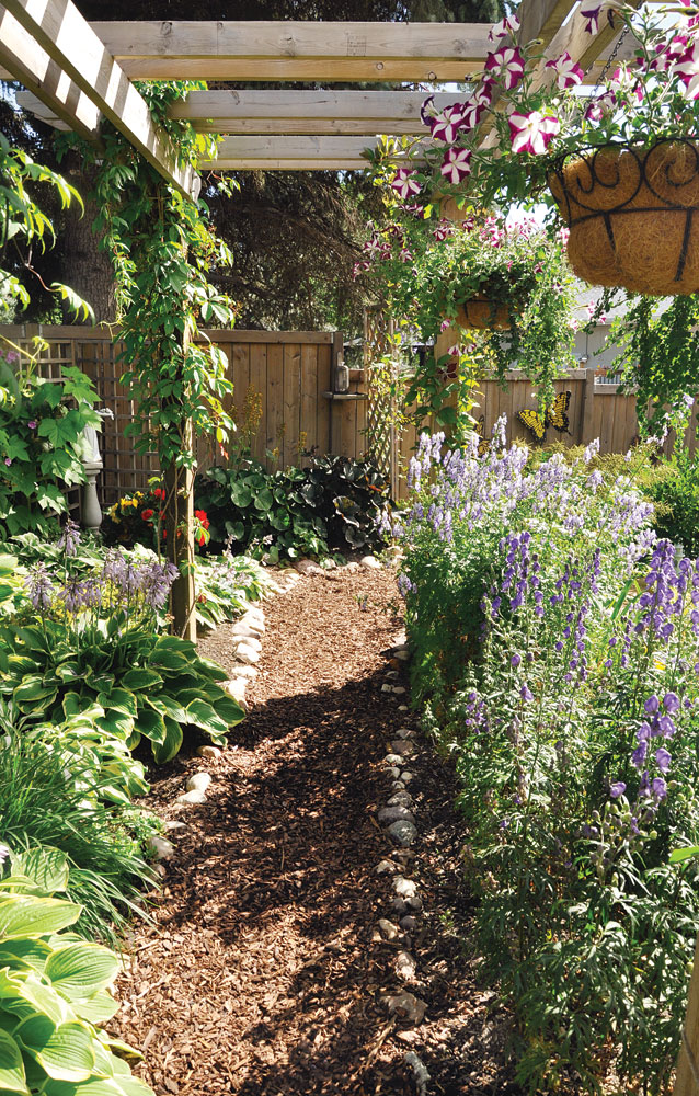 their more focused buying habits at local garden stores, large and small. The garden is also reasonably sized, so to reduce future labour, their plans for next year include adding more shrubs to replace some of the perennials. “We’ll add some shrubs, hardy roses probably, to one back bed. We’d also like to remove a rock border along our front walk, it is tedious to keep free of debris, and add some ground covers and small shrubs,” says Jon.The garden brings a lot of joy to the couple and they enjoy sharing it with others. “We love entertaining and sitting in our garden and do so as much as possible each season. Once we had a group of friends here for lunch on the patio and they were thrilled by a visit from a hummingbird, this was especially fun as we live in Hummingbird Court,” laughs Pat.