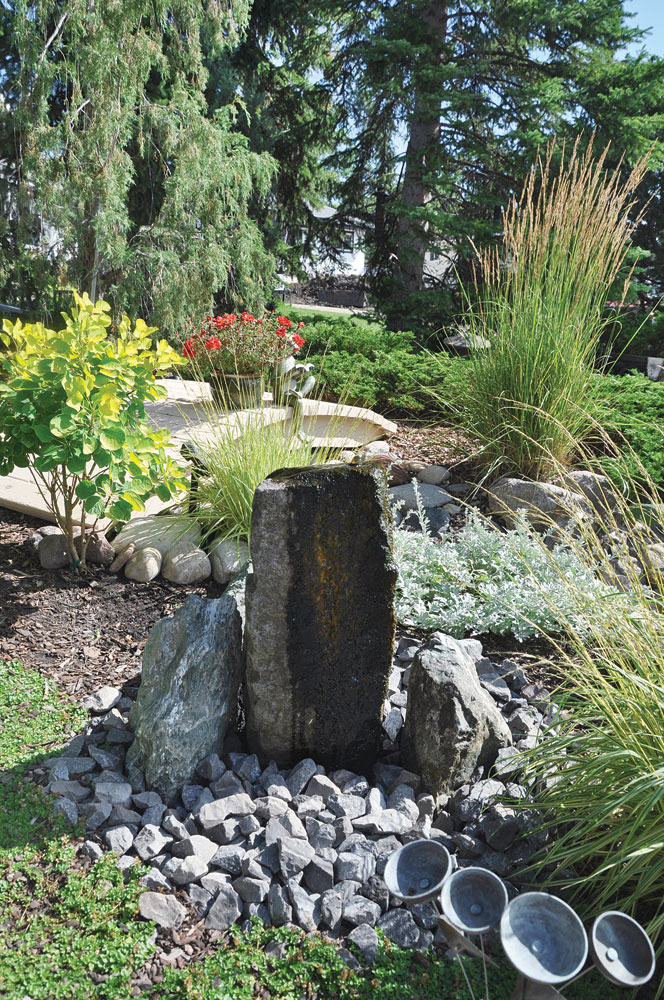Street side, they traded a lush lawn for the gentle sway of Karl Foerster and Overdam grasses and a graceful Tolleson’s Weeping Blue Juniper, colourful ground covers, evergreens such as dwarf mugo pine, juniper, cypress and yew, textured shrubs and perennials. Spots bare of greenery are filled with shredded bark mulch, but the eyes focus on the dry stream bed, which is carried off by rocks of assorted sizes and complimented by the placement of driftwood, an abandoned boat and other ornamentation.