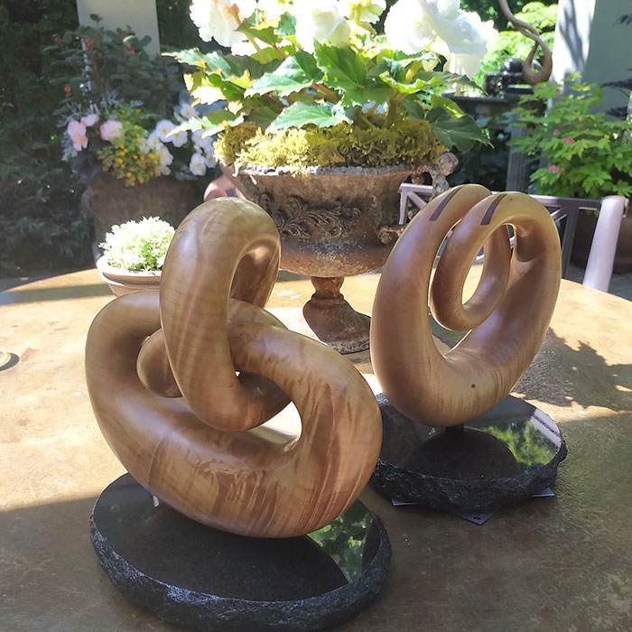 Garry, who is retired from business, carves beautiful works of art out of maple—and even a curious piece made from the remains of an aged hibiscus that he polished and smoothed and made into a stature resembling a hand. It even has fingernails and a thumb! However, his work usually involves eternity knots carved from maple wood.