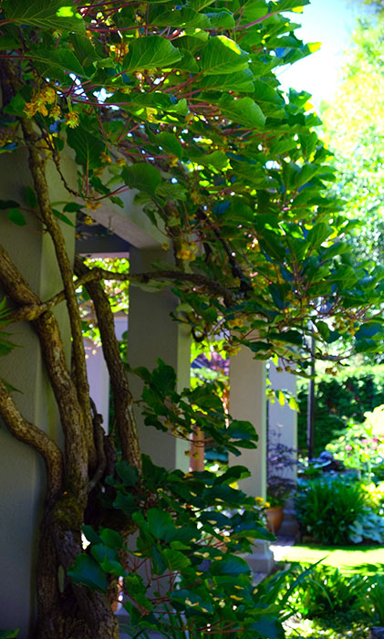And there is more. A mature kiwi vine winds up a patio pillar. Its slightly oak-shaped leaves provide dappled shade below. It was covered in fruit, but Brenda says that, though they have taken as much as two five-gallon pails of fruit from the vine, no matter what they did, the fruit never ripened. “It looks ripe, but it is not edible,” says Brenda, who notes that the unripe kiwis have a very astringent flavour. “Maybe this year,” she says, hopefully. The 2020 summer was uncharacteristically warm.