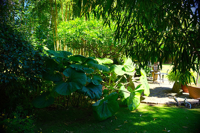It is not hard to see where the proceeds were spent as you look around this wonderful garden. There are so many interesting plants. Carelessly growing among some ligularia is a clump of bears’ breeches which sport lovely big leaves. Green is the colour du jour here and large leaves predominate. Lovely ferns, including a very happy looking Japanese painted fern, surround a small water feature at one end of the patio.