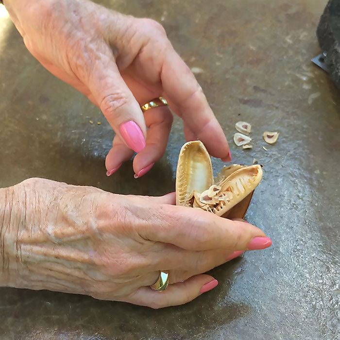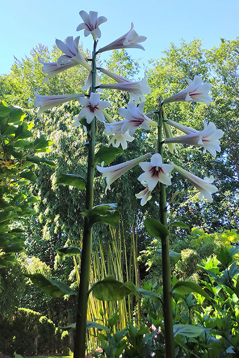 Bamboo is not the only treasure in Garry and Brenda’s garden. There was an 8.5-foot-tall crinum lily, Cardiocrinum giganteum. This flower is a wonder, with 8-inch, trumpet-shaped white blossoms sporting maroon centres. Not really a true lily, it has a vanilla scent and heart-shaped rather than strappy leaves. When planted from seeds, it takes about seven years to blossom, then dies once it is finished. Brenda is amazed at the seed pods whose three compartments hold 400 to 500 little seeds surround by a transparent coat.