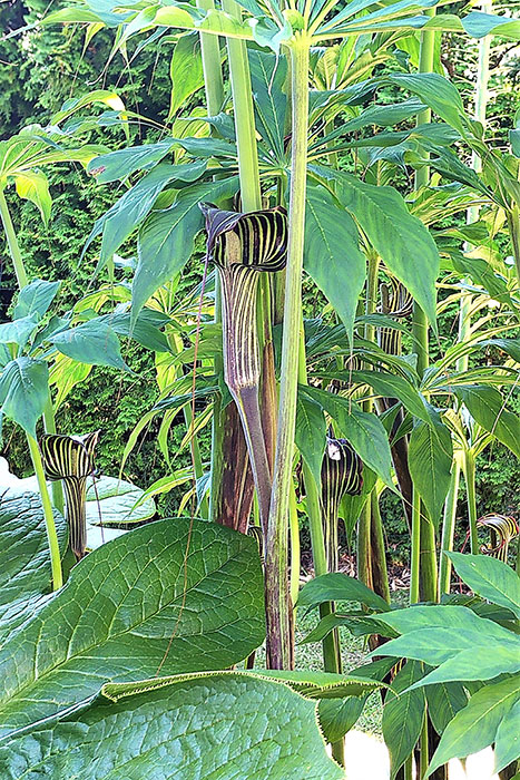 Then we come to the cobra lily. “That’s our whole little family: Mommy, Daddy and the babies,” Brenda says with a laugh. This tall pitcher plant, Arisaema costatum, has lovely striped heads which are actually leaves that curve over and under to set a trap for passing insects.