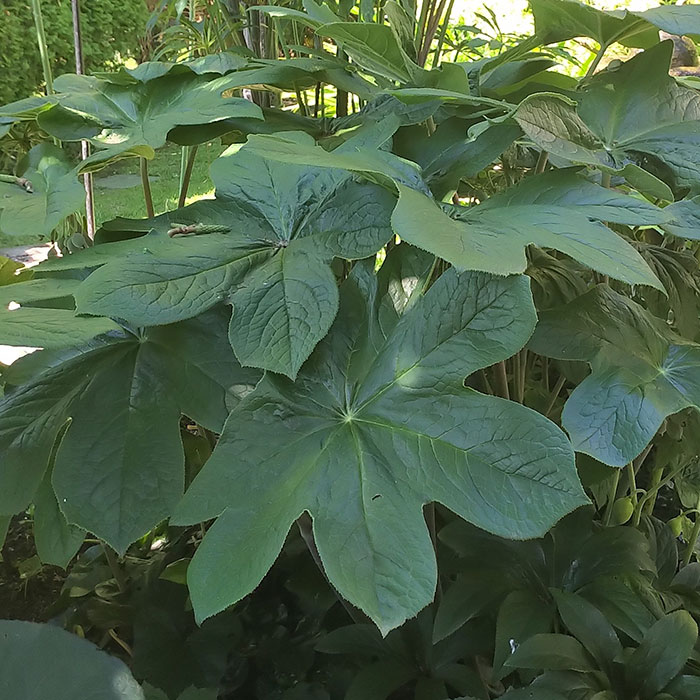 Growing among them and beside them is a beautiful, large-leafed plant, Podophyllum pleianthum, a very special species of the mayflower or mandrake plant. The 13-inch leaves are only slightly notched in seven lobes. Brenda pulls back a leaf to reveal a cluster of berries. “They are cherry black when they come out,” she says. They gradually turn pale green as they mature.