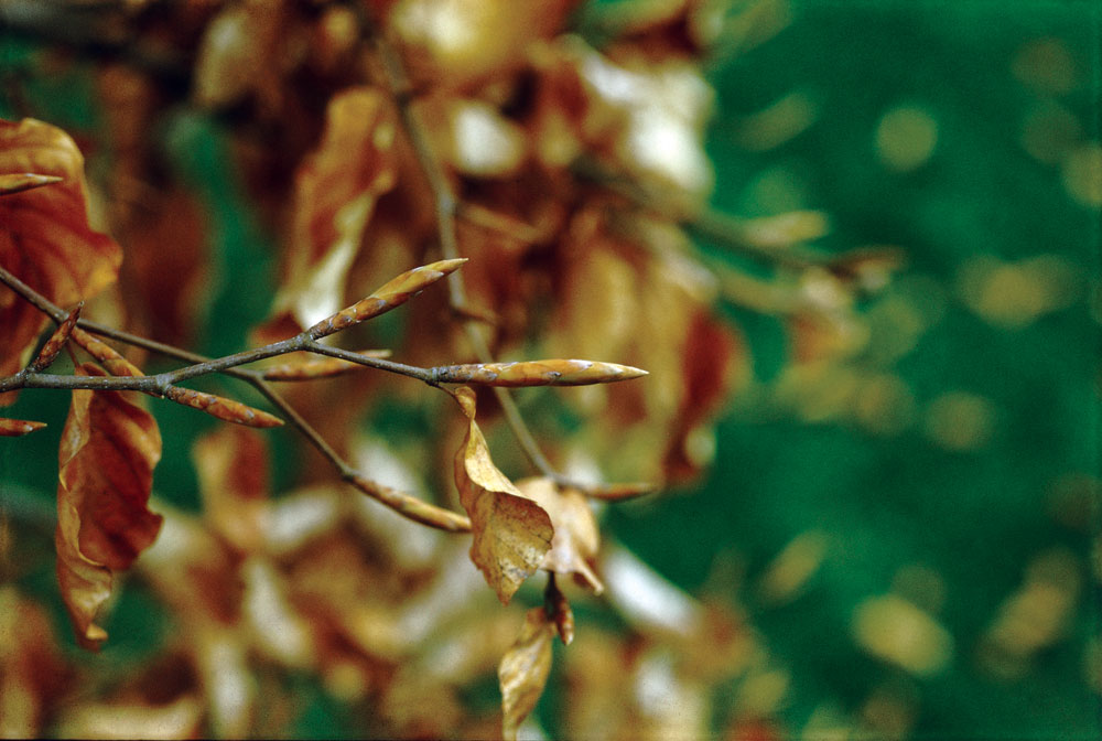 The first leaves that grow in spring can be so bright that they are almost fluorescent green. The green pigment is chlorophyll. This pigment is easily destroyed by light, so it needs continual replacement. Yellow-orange carotenes assist in photosynthesis but the yellow is masked by the green and can only be seen in fall as chlorophyll production begins to diminish.
