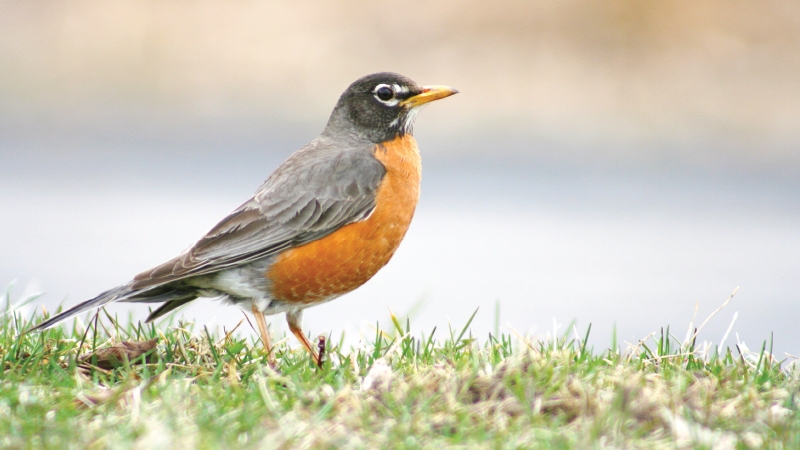 The American robin’s diet is a combination of insects and berries. Insects like earthworms, beetle grubs and grasshoppers make up about 40 percent of their diet while the other 60 percent is a mix of berries and fruit like crab apples and mountain ash berries. When searching for insects, robins use a multitude of skills like their strong vision and sharp hearing. Studies have shown that robins can even hear worms underground. They will tilt their heads from left to right to detect movement in the soil then pounce upon the spot and pull out their catch. Robins take full advantage of human activities like freshly mowed lawns, sprinklers and freshly turned soil to find food. They will even come to birdfeeders for meal worms, suet and raisins.