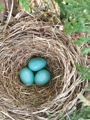 Robins are not only one of the first birds to arrive but they are also one of the first to start nesting. The female builds the nest on her own in shrubs or evergreen trees. To encourage American robins to nest in your yard, consider a nesting platform placed in a secluded spot. Robins will have up to three broods per season and will have three to five chicks per nest. The eggs hatch in about 14 days and a mere two weeks later the young will fledge. The chicks are fed a variety of worms, insects and berries.