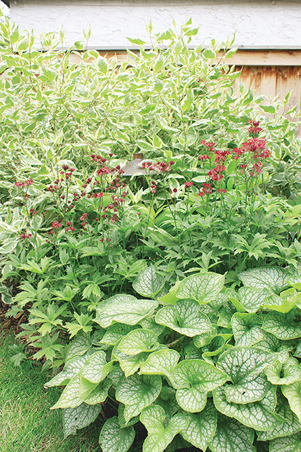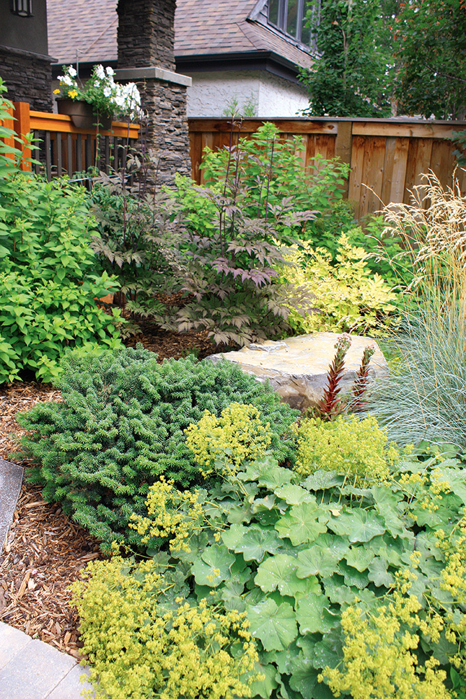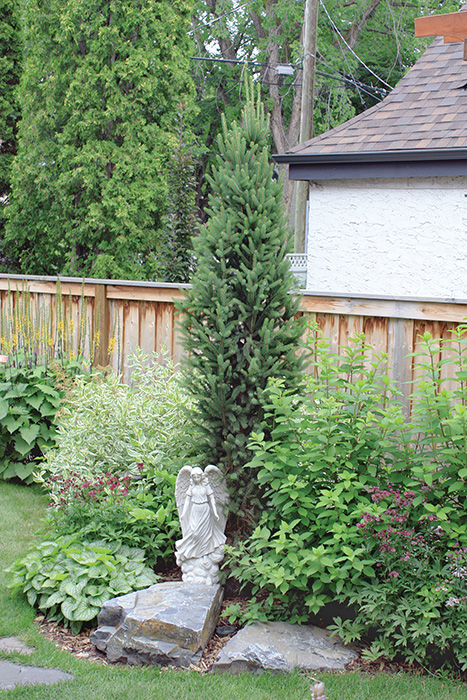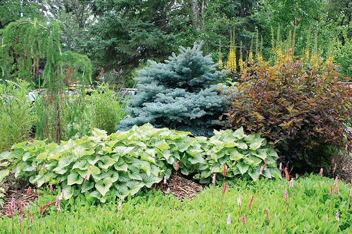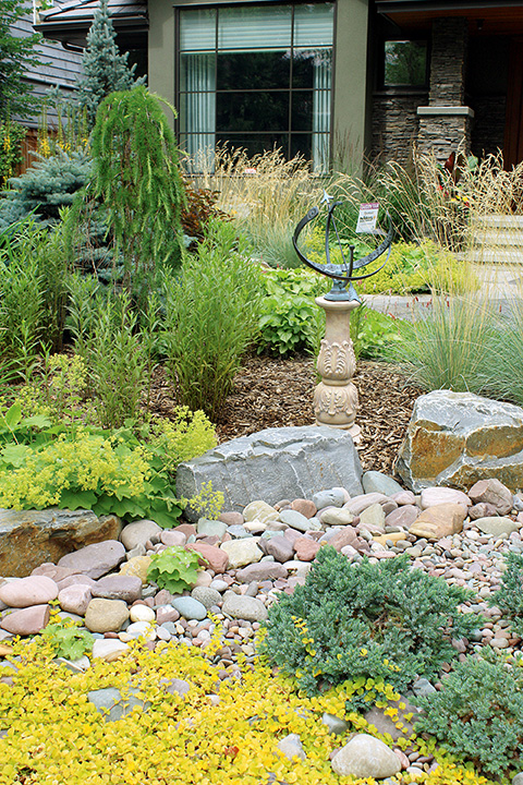 The garden is a perfect balance of texture and colour complemented by two statuesque urns, a sundial and rockery-style plantings. Evergreens and deciduous shrubs and trees grow side by side. The vibrant blue needles from spruces mix harmoniously with the delicate green of junipers and cedars. Dainty features such as the red-winged samaras from a tatarian maple and branches of the weeping larch are balanced by the coarser-shaped leaves of blooming ligularia. Burgundy ninebark and elders contrast with the variegated leaves of lungwort and green leafed shrubs of varying shades. The result is breath-taking.