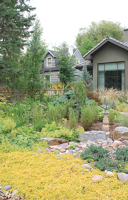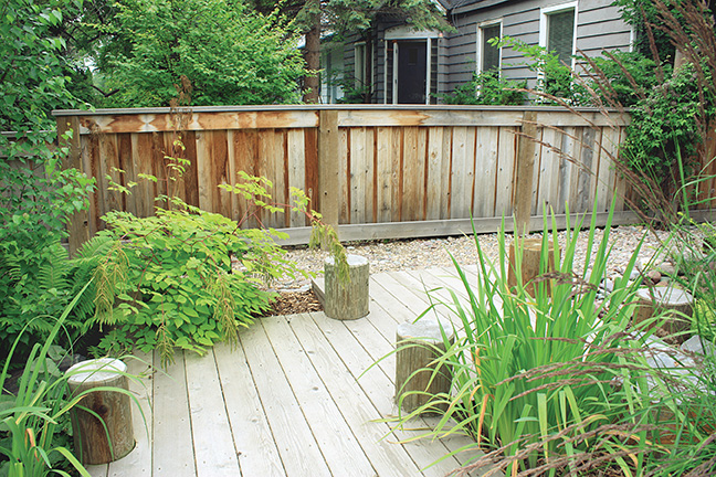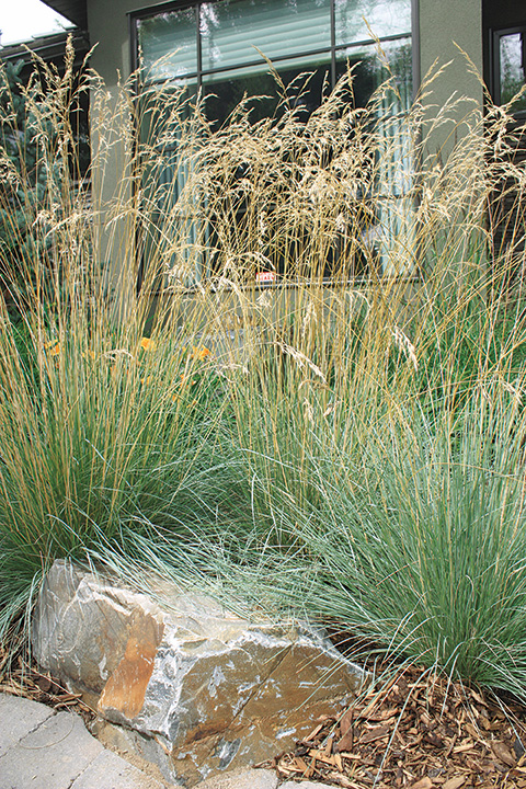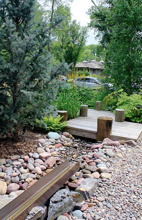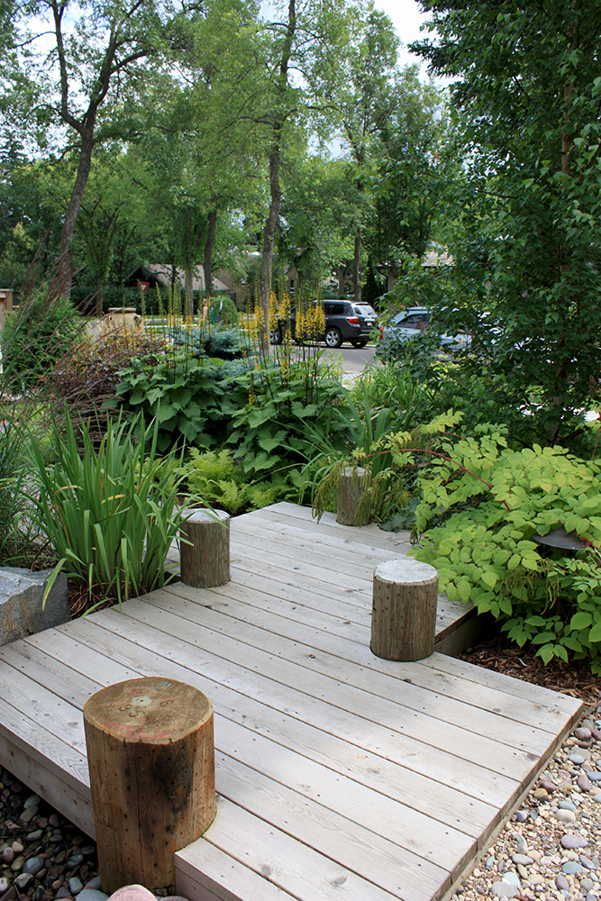 There is no room for ordinary grass here. Tall statement grasses grow along the house next to a raised wooden walkway reminiscent of a lakeside boardwalk. Rocks are used throughout the front half of the gardens adding to the appeal while wood mulch keeps plant roots moist and happy along the upper garden.