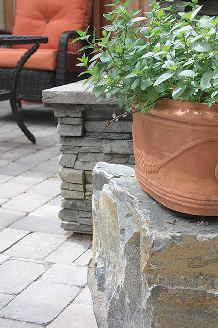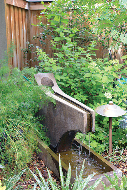 The back gardens surround a patch of lawn adding to the social space and like the front are expertly designed with contrasting colour and texture. The use of rock has been carried through; they are used to edge the garden, on a small flagstone path and as accents. As in the front, Sharon and Ken O’Reilly have found unique additions for the garden including an industrial style fountain.