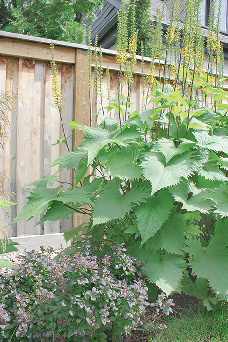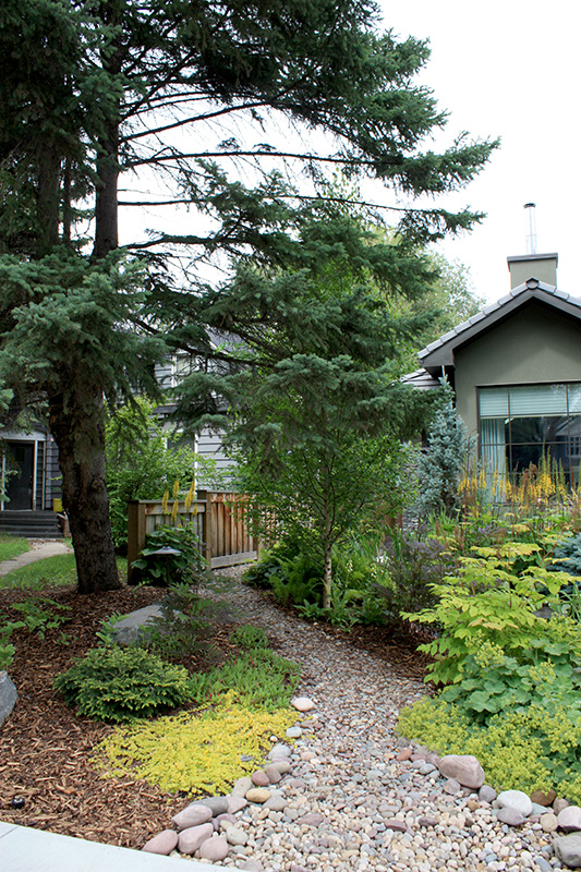 A dry stream bed runs under the boardwalk and is used to funnel rainwater away from the house via a rain chain and long copper trough. Boulders punctuate the landscape and a stone path snakes along the side of the property leading to the backyard. Creeping jenny spills over the rocks and onto the sidewalks and paths. Even the boulevard is immaculately maintained with wine coloured heuchera, hostas, lilies and sedum.