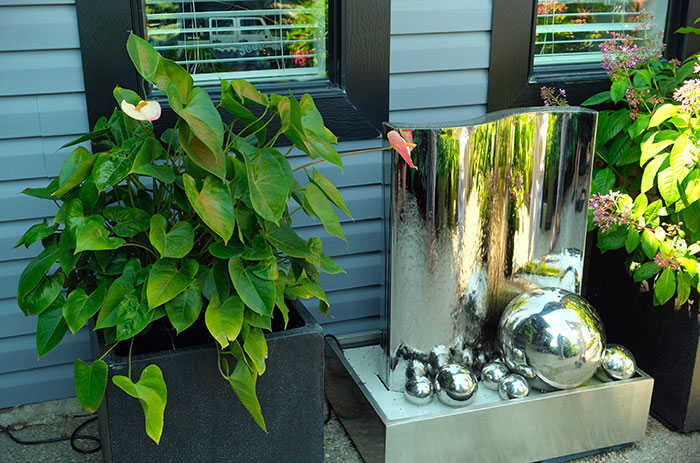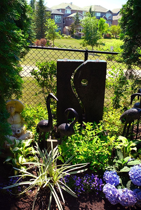 As we leave the front steps, I spy something that sets bells ringing: a unique water fountain that I have only seen once before, in Edmonton, its mirror-like exterior and shape unmistakable. “Have we done your garden before?” I ask in bewilderment, although I know that where I had seen the fountain in the past was not a corner lot as is this one.