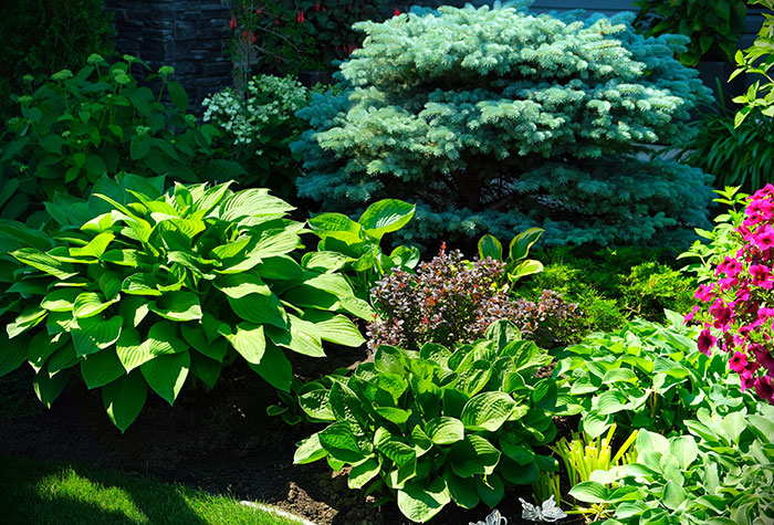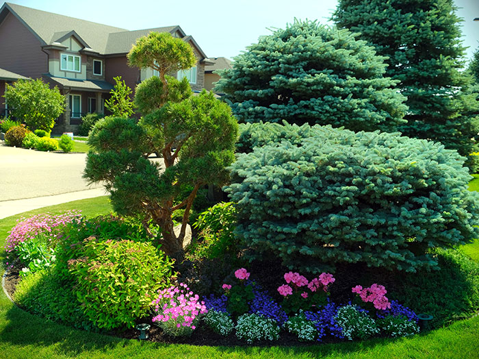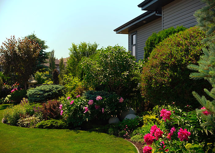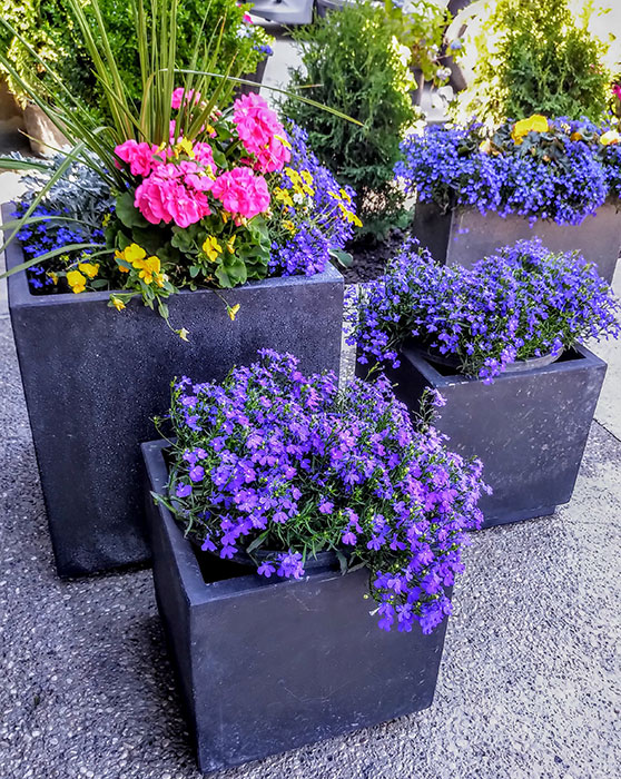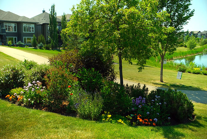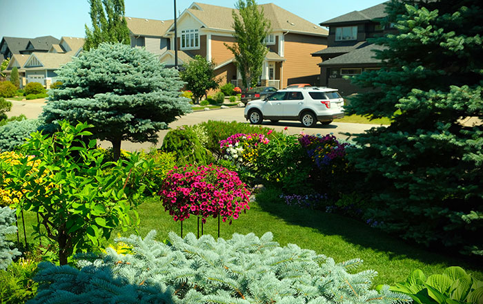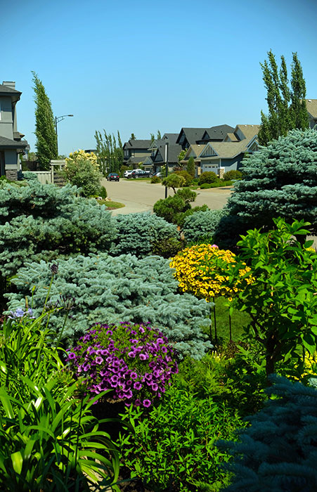 The second thing is a wave of beautiful sun-tolerant lobelia spilling over the edges of three attractive planters. This display sets the stage for what is to come: a journey through meticulous planning and planting outside this Edmonton home. The yard is a vision of well-balanced grooming: shrubs are neatly pruned and shaped, the curved beds are carefully planned, with low plants at the front, harmonious colour schemes, and careful attention to texture and form.
