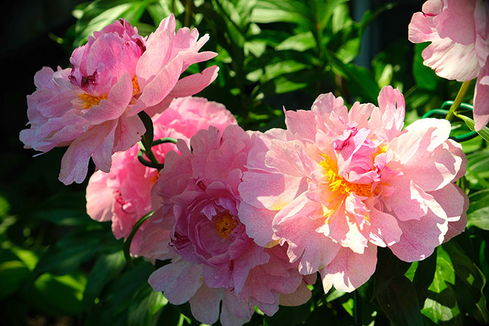 It is late June in Alberta and peonies are in their full glory. Everything is lush and brilliantly green, except the blue spruce, which are decidedly blue, contrasting with the bright yellow-green of a northern lawn well fed with summer sunlight. A blue nesting spruce is edged with pink geraniums, set off by deeper blue lobelia and clumps of white. Leona has an eye for balance. Well planned annuals baskets are set among the perennials at heights that please the eye. Yellow and magenta, deep blue and white seem to be made for each other.