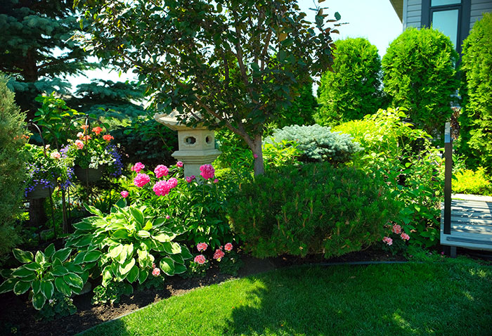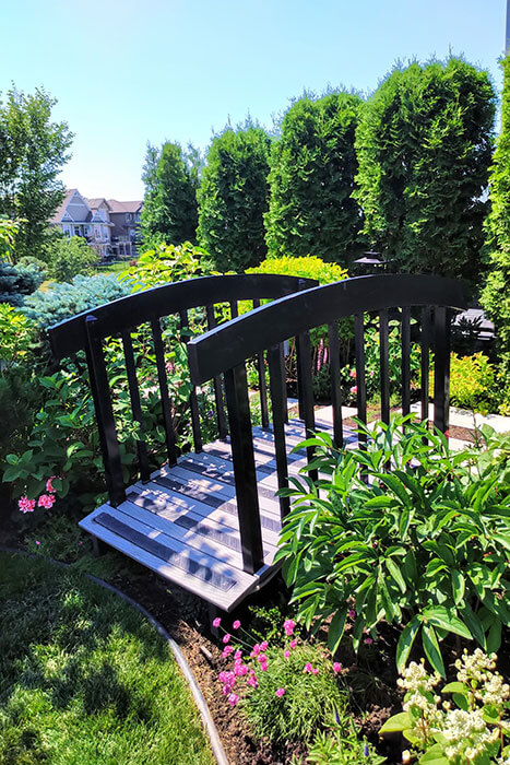 The garden here has borrowed from a Zen aesthetic, with oriental lanterns and metal ornaments of cranes and small animals. The eye travels onward to the other end of the garden, where there is an arbour to lend shade on hot Edmonton afternoons, complete with seat and table beneath it.